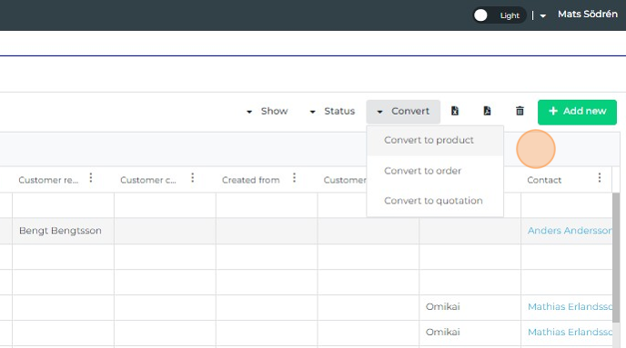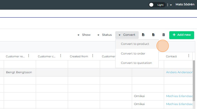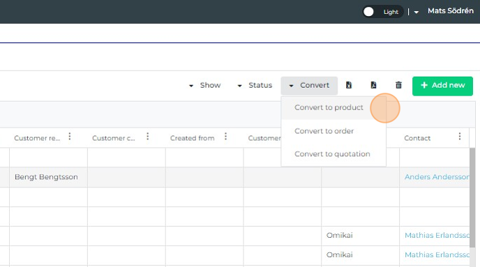 From the open quotation, click Convert in the top-right corner. Choose Convert to Product.