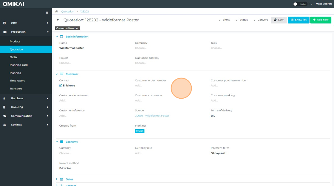 A new order is created from the quotation. Enter additional information as needed. Set important dates so planning can start.