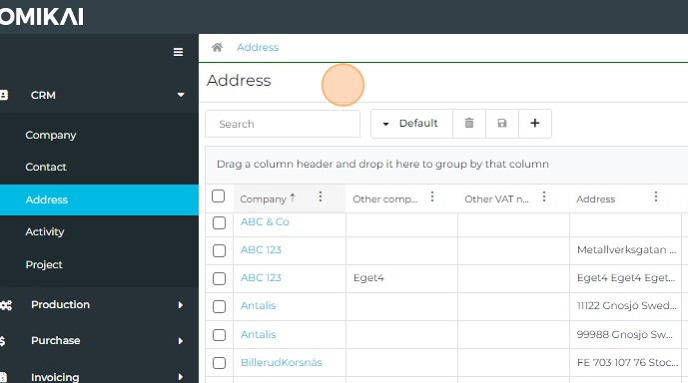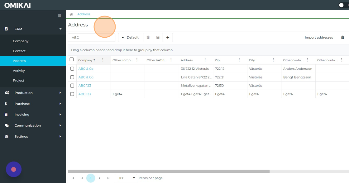 In the CRM module, click Address to open the list. You can also go directly to addresses.
