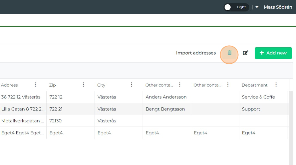 Click the trash bin icon to delete the selected address.