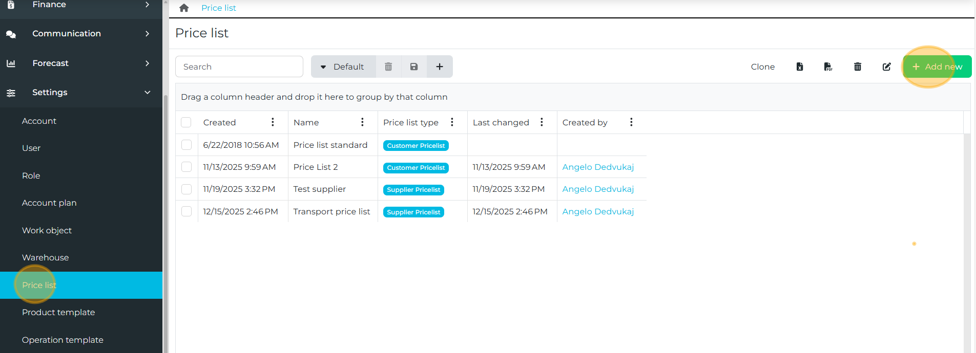 - Name: Enter a descriptive name (e.g., "Standard price list" or "Transport price list").