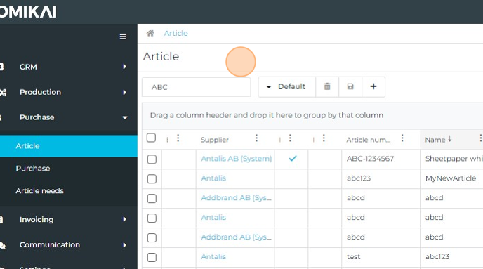 In the left menu, go to Purchase and click "Article" to open the articles overview page (articles).