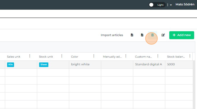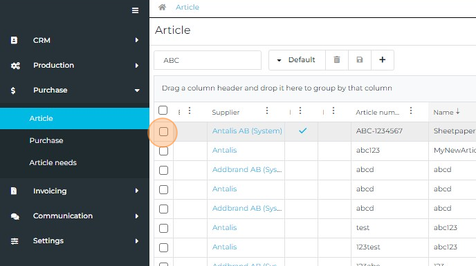 This guide explains how to delete one or more articles in the Purchase area. Deleting removes the item from the articles list in the system.