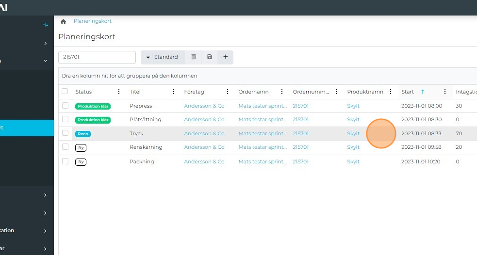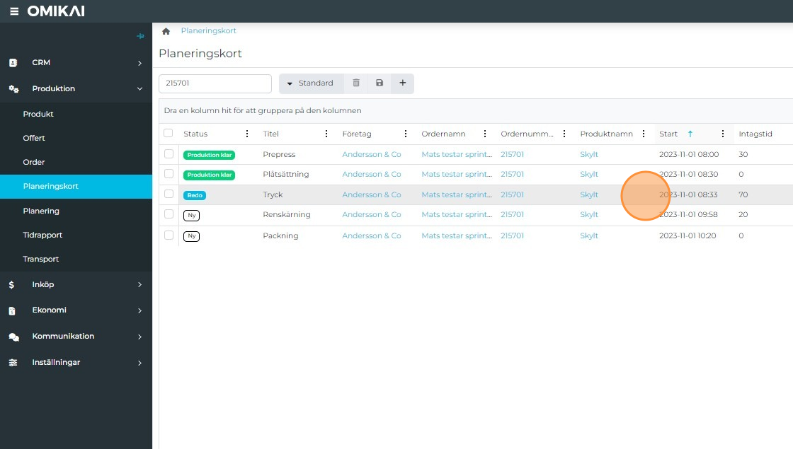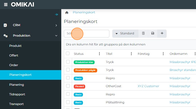 Open the Planning card tab in the Production area.