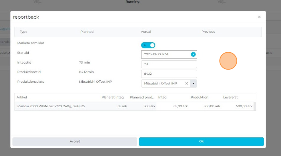 The dialog shows the planned scope, for example: Intake time (e.g., 70 min), Production time (e.g., 84.12 min), and material consumption (e.g., 65 sheets for setup and 500 sheets for production). In the "Delivered" field, enter how many good sheets go to the next operation. If everything is correct, click "OK".