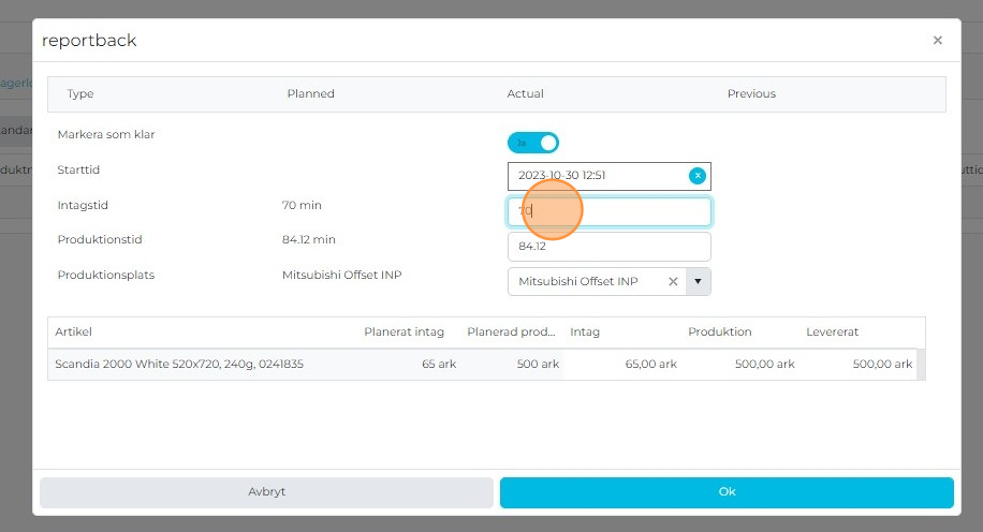 If the actual Production time is different, overwrite the Production time field with the correct minutes.
