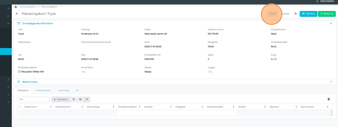 The planning card shows estimated time for Intake and Production, and the calculated material quantities. When you begin work on the operation, click "Start".