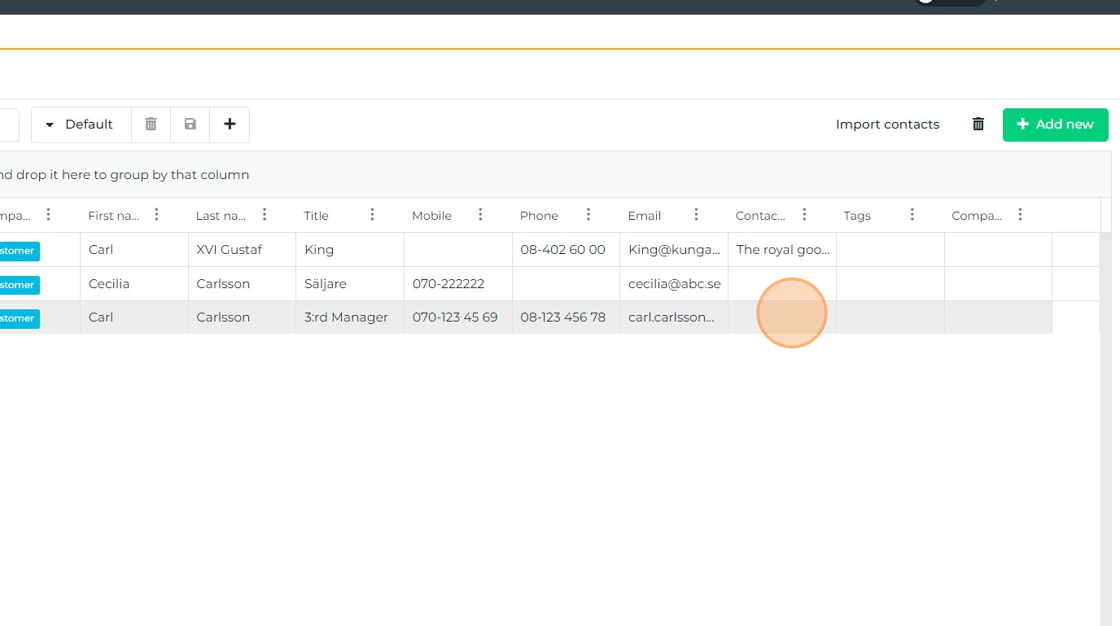 Goal This article explains how to create a new contact for an existing company in the system. You will open the company record, view its related contacts, and add the new contact on a new row. Procedure Step 1: Open the companies list In the CRM ...