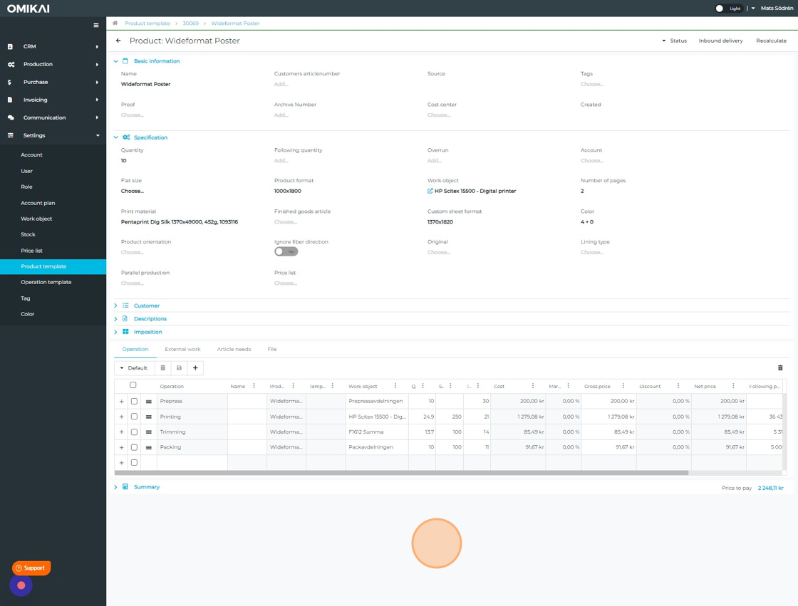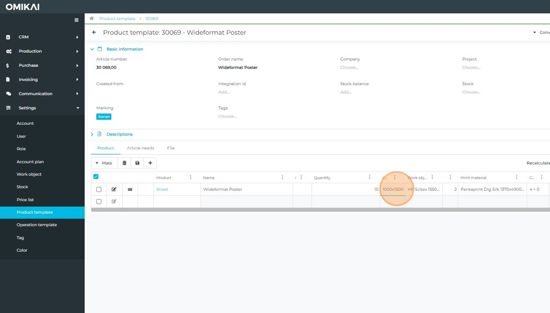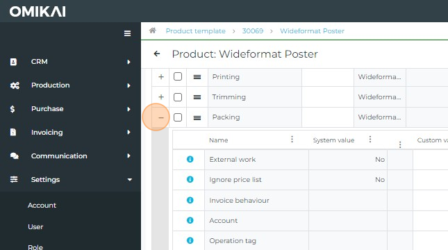 This article explains how to update a product template in the system. You will change fields in the product section (for example, size settings) related to products, and fields in an operation (for example, setup time for packing) related to operations. Changes are saved automatically when you leave a field.