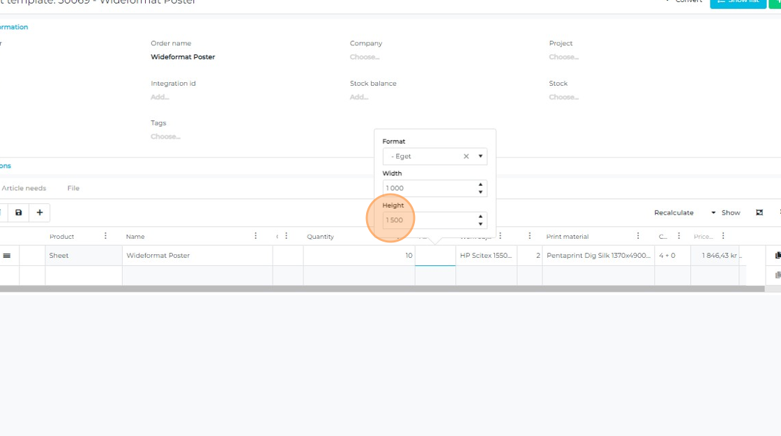 In the product section, click the field you want to change (for example, width, height, or other size settings). Enter the new value.
