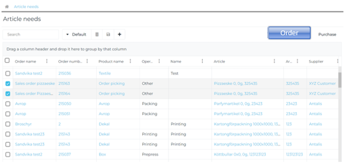 After you add articles, the system creates article needs for the order. Open the article needs view to confirm that all items and quantities are correct. If stock is not enough, the article need will show that production is required.
