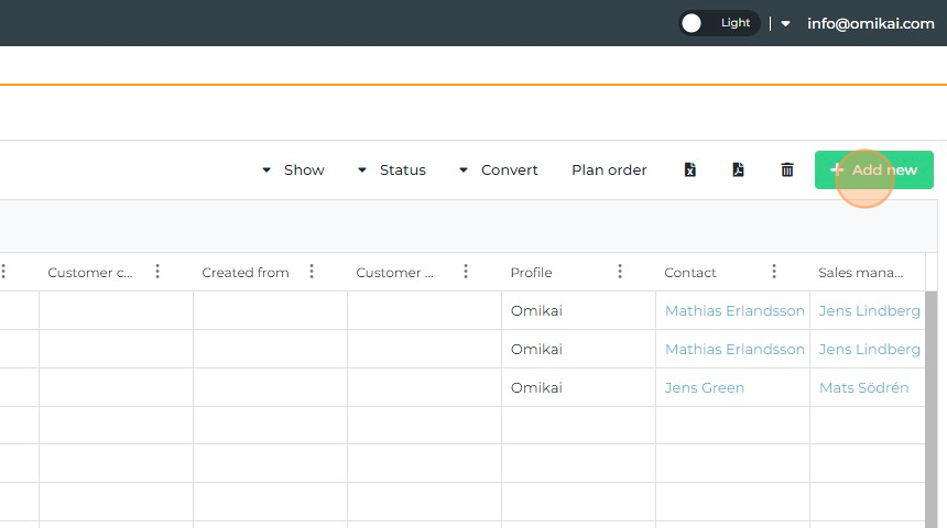 Open the list of orders. Click New to create a sales order.